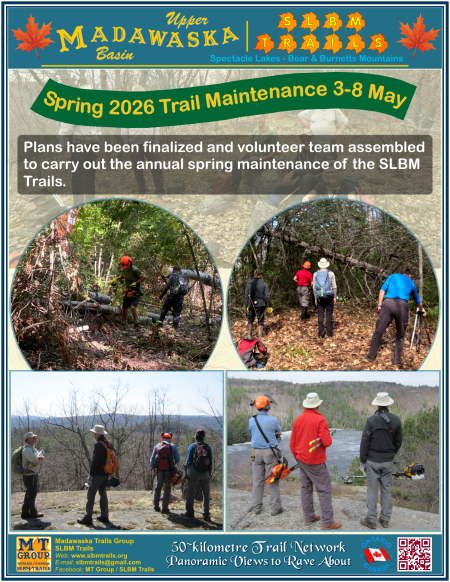Biting Insect Calendar and Preparations to Fend Them Off  2024-05-24: The biting insect season has begun. But, with some simple preparations to fend them off you can still get out and enjoy hiking on the SLBM Trails. Also, below is calendar indicating when each type of biting insects are active in the Algonquin region (which includes SLBM Trails).