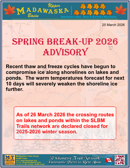Spring Break-up Advisory  2026-03-25: Winter crossing routes on lakes and ponds are closed for the 2025/2026 winter season.